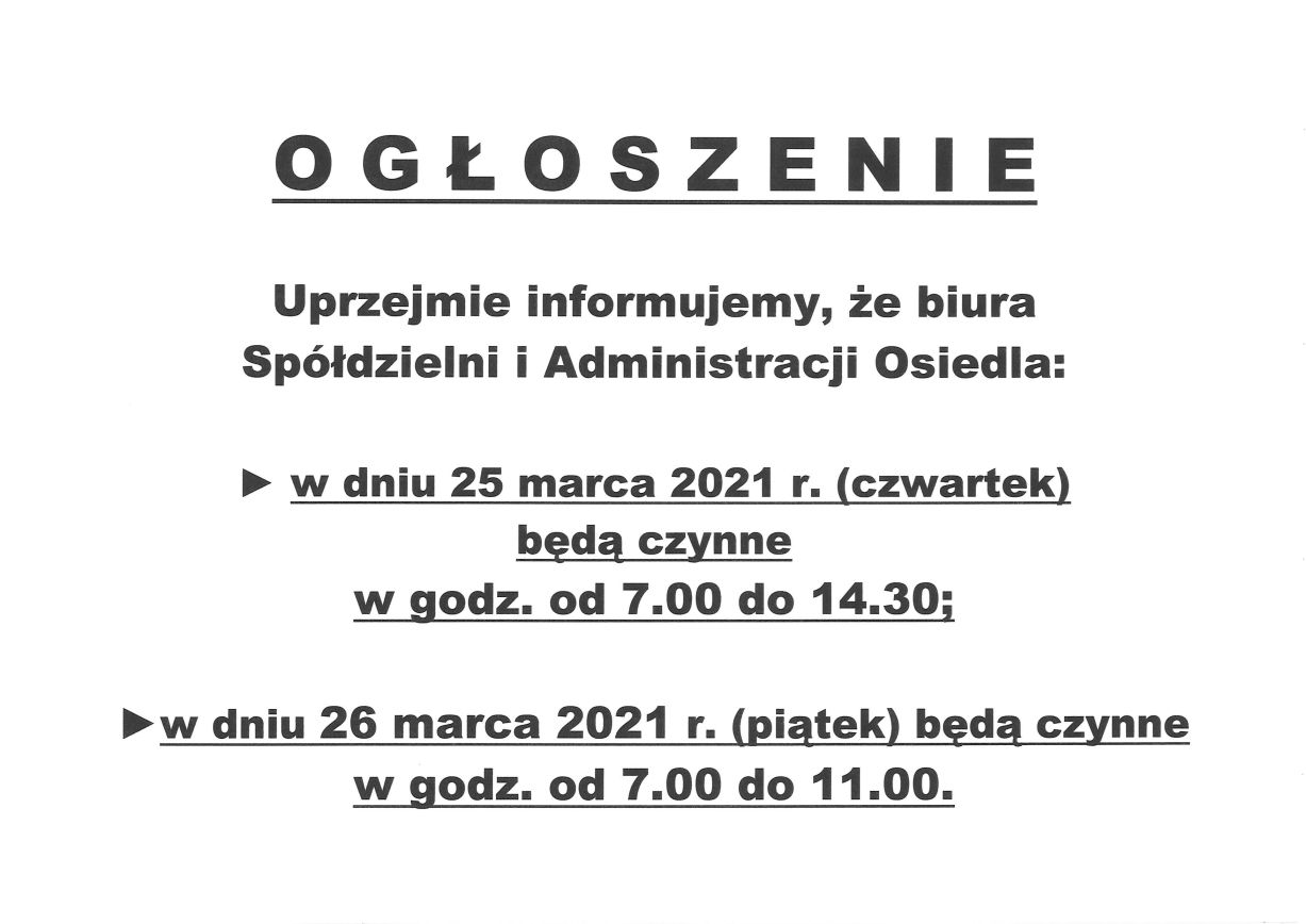 Informacja o godzinach pracy Spółdzielni